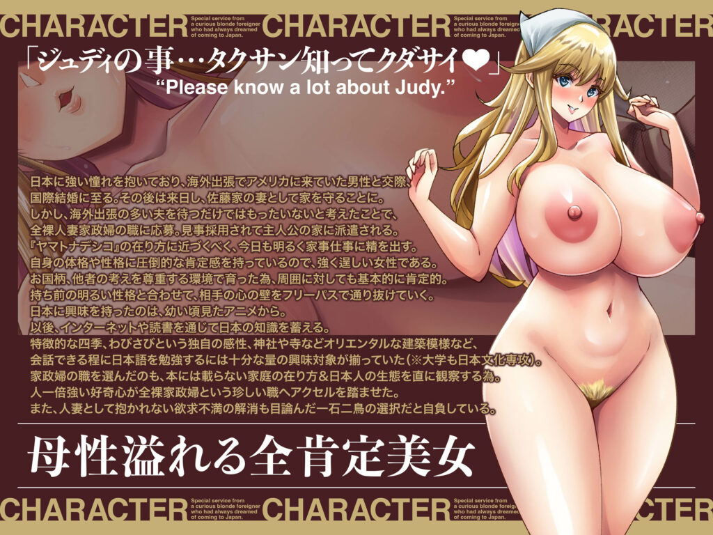 【ブロンドアメリカンな金髪外国人】オホ声イグイグ人妻全裸家政婦 ジュディ・早乙女・ラティアーは、人妻という属性を無理なく物語に落とし込んでいる点が特徴です。